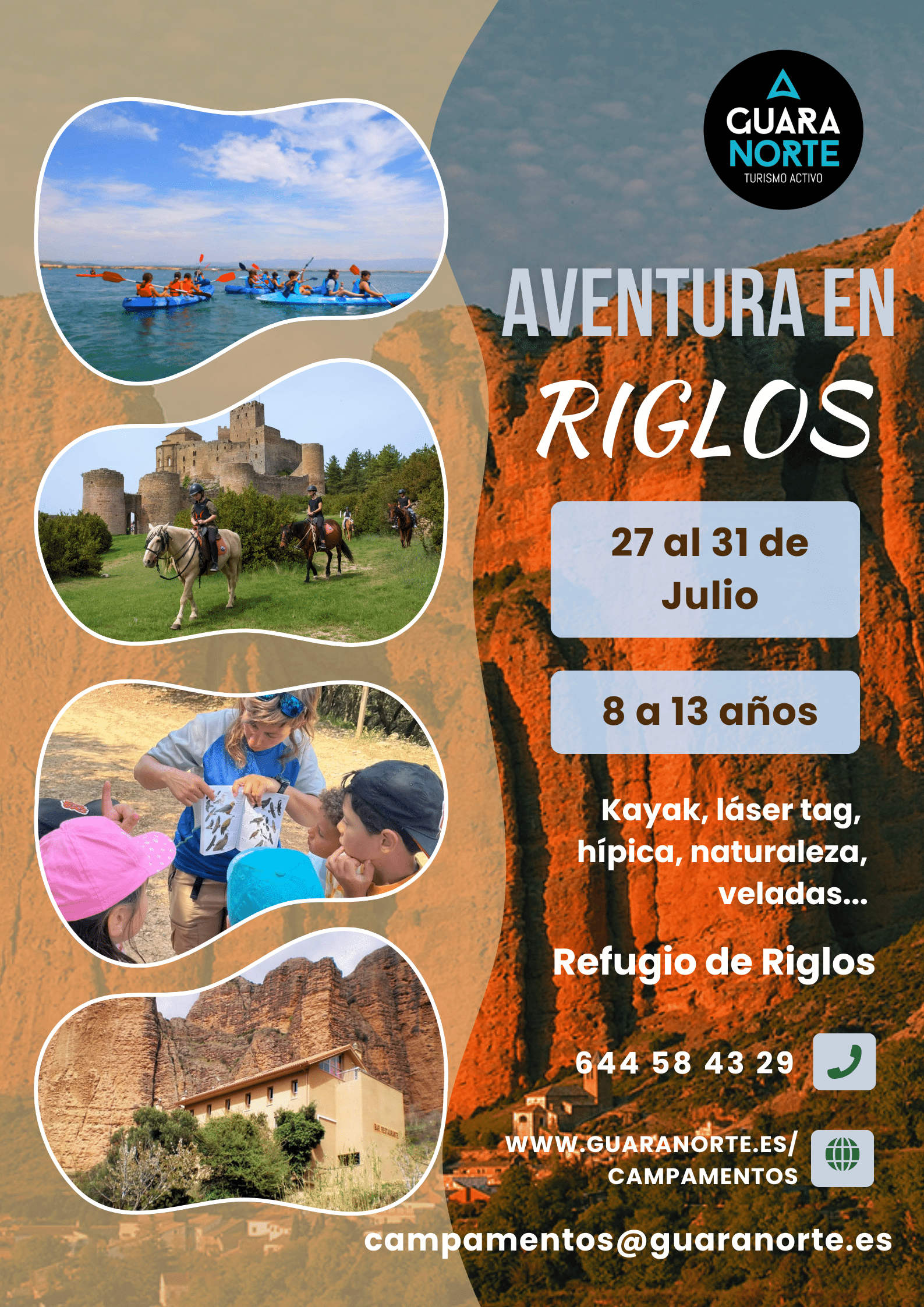 Días invernales para realizar esquí de fondo y raquetas de nieve, o jornadas de finde curso en las que podemos ir al embalse de la Sotonera y practicar Piragüismo al mismo tiempo que realizamos una gynkana de juegos en la naturaleza, o también para los más peques, un día en Sabayés descubriendo curiosidades acerca del Salto de Roldán, aprendiendo mientras jugamos rodeados de naturaleza. Y nuestra novedad de esta temporada, un paseo a caballo por los alrededores del castillo de Loarre y una visita al Laboratorio Paleontológico, donde nos contarán como han descubierto huevos de dinosaurio en la zona de Loarre.